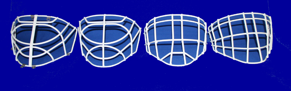 Cages from left to right: “Double Bar Cat’s Eye”, “Mike Richter”, “Don Beaupre”, “HECC Style”