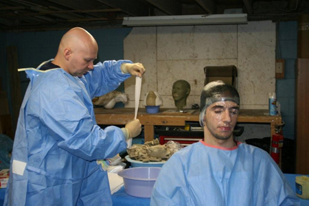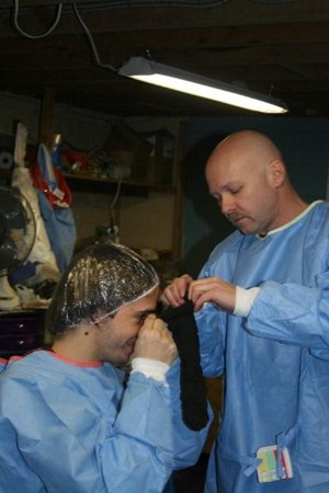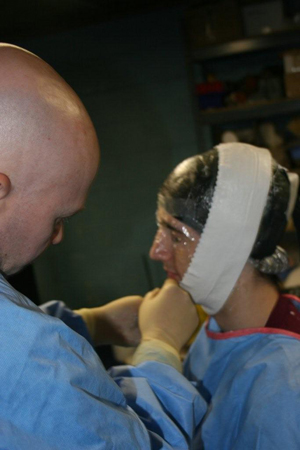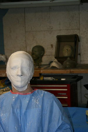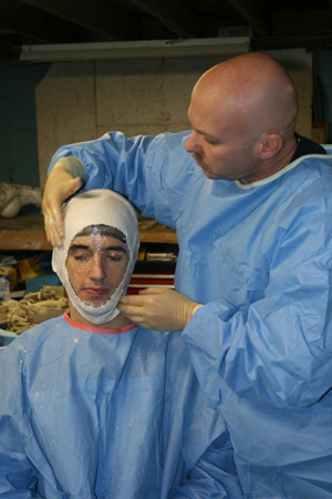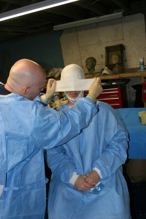 | The friend then grabs the foot end of the stocking and stretches it back then tapes it to the back of the head avoiding wrinkles in the tape. This will become important when later casting the back of the head. |