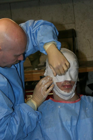 | Next grab the edge of the mold near the ears and pull forward in a steady slow motion. INSTRUCT THE GOALIE TO KEEP HIS EYES CLOSED UNTIL THE MOLD IS OFF AND THE VASELINE IS CLEARED AWAY. |