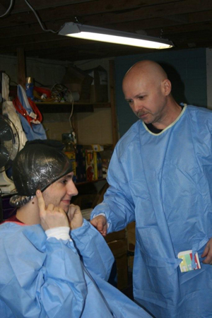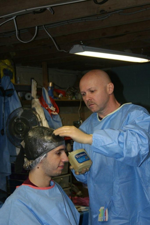 | Next, a smooth, fairly heavy , EVEN coating of Vaseline is applied with a sponge to the entire head, face, back of the head, ALL facial hair including eye brows, eyelashes, mustache, side burns. |