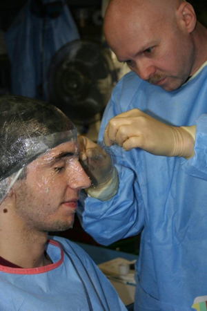 | The goalie then places a finger on the stocking in front of each ear while the friend tapes the stocking to the skin. |