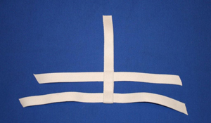 Fold the strip of plaster bandage lengthwise forming a 3” wide strip. Immerse the strip in the water, remove it, then squeeze out the excess water.